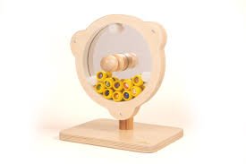A high-quality wooden wheel, styled a little like a ship's wheel. Contains marbles that tumble over each other when the wheel is turned. Designed to offer both movement, visual and sound rewards. The back of the wheel is mirrored and reflects both the tumbling coloured marbles and the child's image.