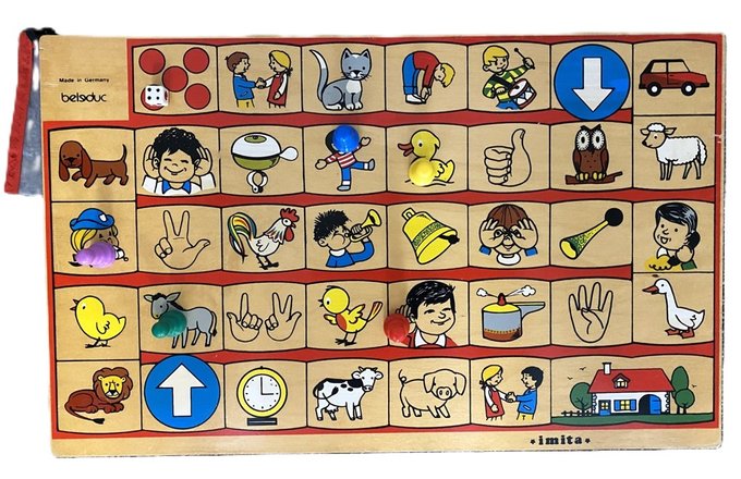 The players throw the dice and play, imitate or describe the different illustrations on the various spaces on the game board.