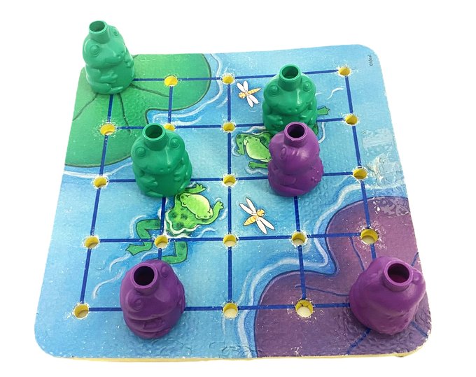 Game consists of 1 playing board, 3 green frogs, 3 purple frogs and 1 set of instructions .