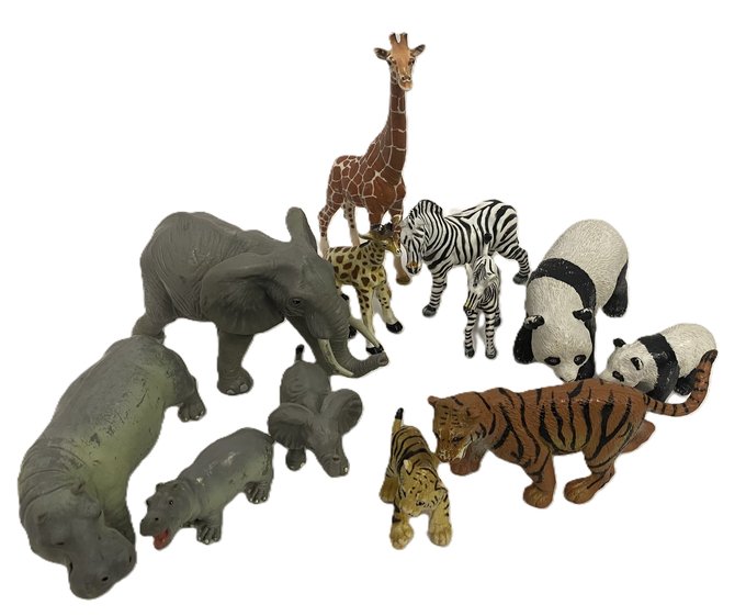 Match the animals - 12 realistic model animals (making six pairs: one adult and one baby each of elephant, giraffe, hippopotamus, zebra, tiger and panda).