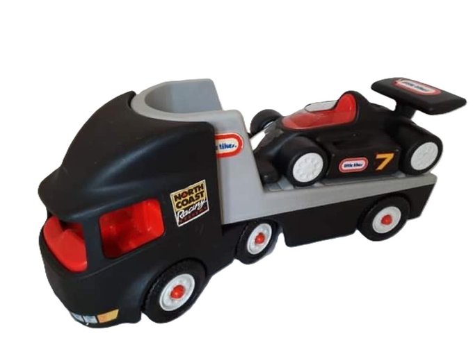 Plastic set consisting of 1 black cab truck, 1 grey trailer and 1 small black racing car (that fits on trailer).