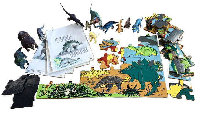 Box contains 11 model dinosaurs; 3 dinosaur pencil rubbing stencils; a 36 piece wooden dinosaur related jigsaw puzzle and a 22 page booklet of dinosaur related information.